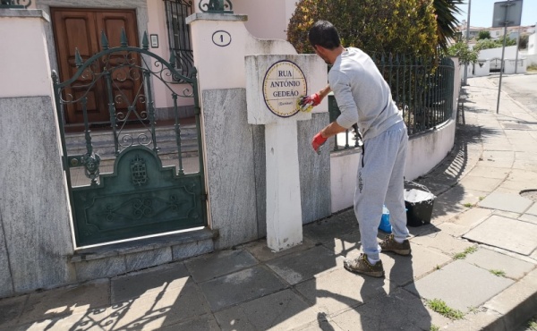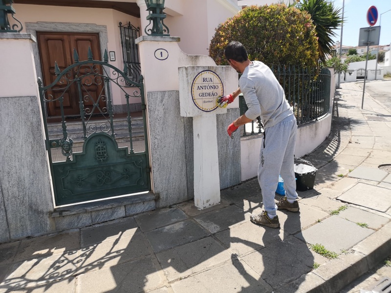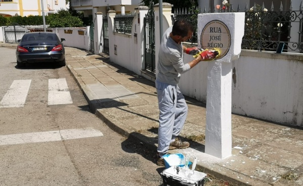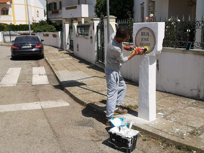 Em paralelo com esta atividade fazemos igualmente a manutenção das placas que identificam as várias ruas. Nesta semana, através de um serviço externo, estamos a efetuar a pintura das placas da Quinta d’ElRey.